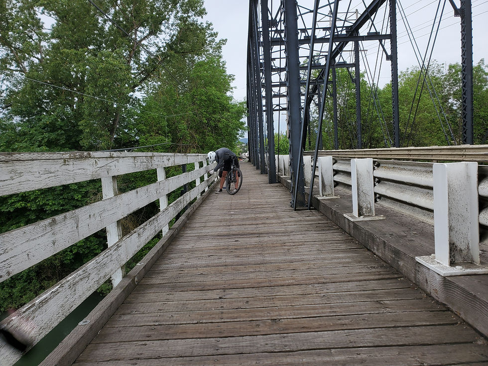 The fireman were up early so we were up early. Still raining this morning but we are committed to getting up the pass. Best laid plans . . . About two miles down the road Erik pulls up with a bump in his back tire. Initially he thought it was a rock in his tread but it was a screw - right through the tire. Luckily the goo in his tire held pressure until we made it back to the fire station (another tender mercy :)). We pulled and patched the tube - still won't hold pressure. Upon closer inspection the screw went through BOTH sides of the tube. No patching that so instead we Uber back to Springfield to the closest bike shop. New tire, new tube and a spare tube to boot then another Uber back to the fire station. At the bike store we find out there is still snow in Mckenzie Pass and it's closed (St George Boys don't think about snow covered passes in late May). With this new information, we adapt our plan. We put Erik's tire back on and head back into the rain toward Mckenzie Bridge. The weather is supposed to be poor all weekend. We don't want to try the alternative summit in cold, windy rain. So, a zero tomorrow and then hopefully better weather when we push up Santiam Pass and then on to Sisters. Final note for the day, once we settled into the lodge I found my chain has split its guide. Need to sort a temporary solution and hope to get it fixed in Sisters. Have never toured before so maybe having all these equipment issues is normal. In six days we have replaced one tire, two tubes, a derailleur gear and need to replace a chain guide. In days . . . Has to get better - never had these types of issues with our hiking gear. Oh by the way, all this fun was my birthday present from the TAT. (Actually my present is being able to be out having this adventure - thank you dear 😘).